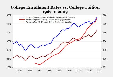 Interestingly, rising inflation-adjusted college costs do not seem in any way to have deterred young people from going to college in increasing numbers, and given that the figure is a percentage, we know that population growth does not account for the change. So what’s up?