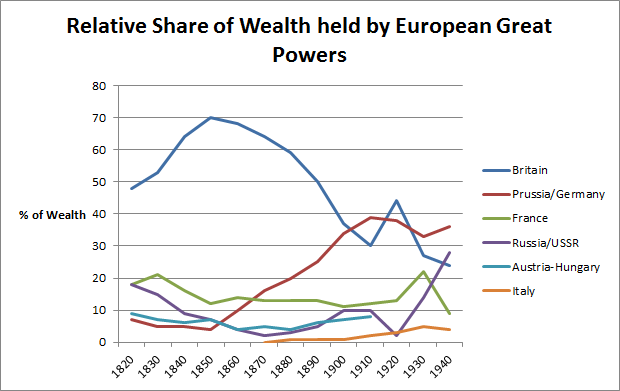 - The rate of British relative decline actually slows as a result of World War I–if Britain had declined proportionally as much as it had from 1880-1910 during the 1910-1940 period, it would have controlled around 15% of the wealth in 1940 rather than 24%.