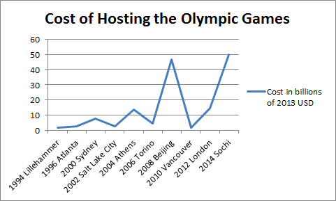 Aside from that, what do we observe? Rich countries hosted the Olympics in ’94, ’96, ’00, ’02, ’06, ’10, and ’12. Developing countries hosted in ’04, ’08, and ’14. Three of the four most expensive Olympic games have taken place in developing countries, and the London games were under immense pressure to remain at least marginally competitive with the ’08 games in Beijing. We observe a bouncing tendency–summer games generally cost more than winter games in part because revenues from summer games are usually higher, but this bouncing pattern has broken this year–for the first time, not only are the winter games more costly than the previous summer games, but the winter games are more expensive than any of the summer games that have been held.