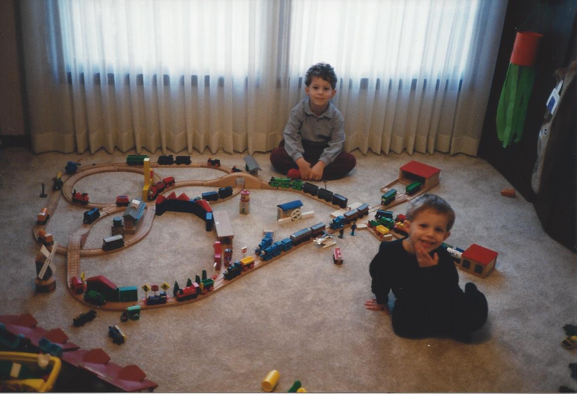 I’m on the right, as James the Red Engine (my favorite). My little brother, who was too young to walk around, was my tender engine. He sat in a little red Radio Flyer wagon, and I pulled him around the neighborhood.