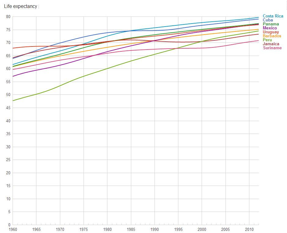 As we can see, all of the Latin American countries that were in Cuba’s neighborhood in 1970 have now decidedly passed it except for Jamaica and Peru. That said, the regime has still been able to remain competitive in other areas. It’s 2nd among these countries in life expectancy (after Costa Rica):