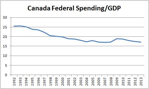 In 2009 and 2010, Canada wisely did a bit of stimulus to aid in recovering from the global economic crisis, and at that point Cato stopped paying attention. What happened after 2010? Harper began reducing spending again. Here’s a chart that shows just Canadian federal spending and includes some of the years after 2010 (unfortunately, Canada’s data for 2014 and 2015 is not yet available):