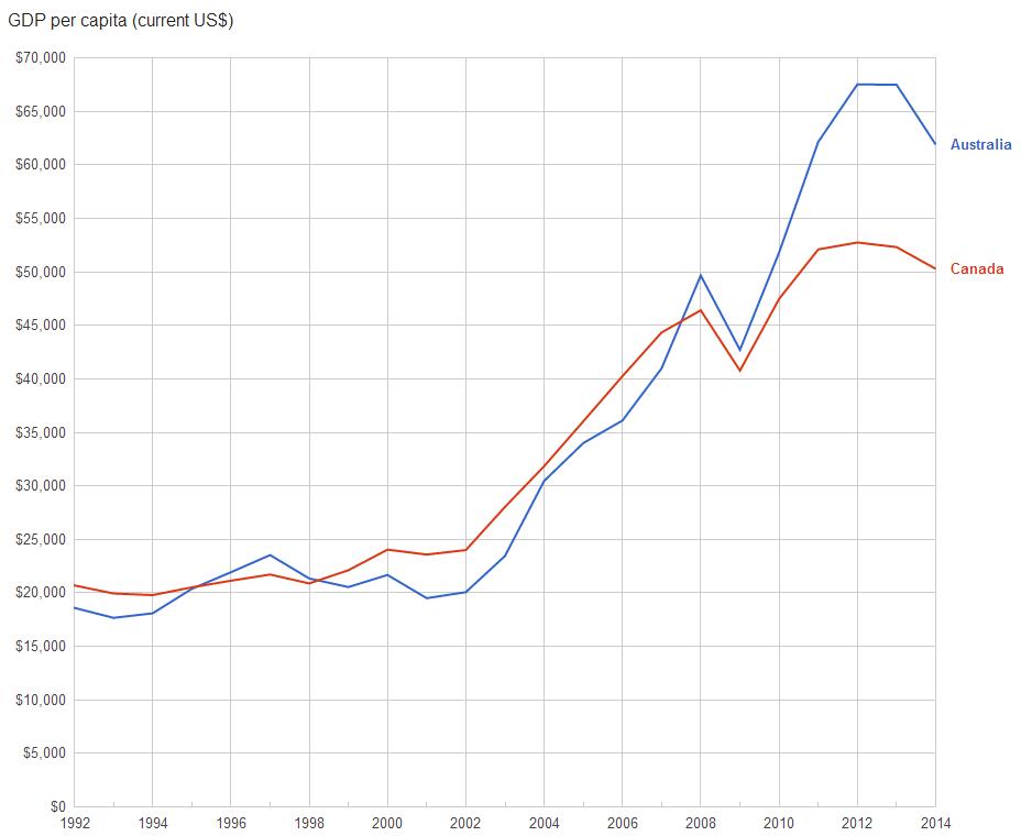 As a result, after leading Australia in economic growth for many years, Canada has now fallen significantly behind:
