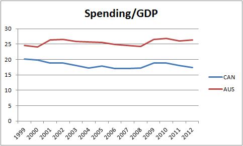 Harper is fond of comparing Canada’s growth rate to the other members of the G8. He points out that since 2006, Canada has outperformed most of these countries on a variety of economic indicators. What he fails to mention is that most of the other G8 countries have far more serious problems. Russia is far more dependent on oil and is currently under crippling international sanctions. Japan has a rapidly aging and shrinking workforce. Germany, France, and Italy are stuck on the euro and mired in its currency crisis. Britain has been squished by severe budget cuts since 2010. Harper is calling a tortoise “fast” because it’s won a race with a bunch of snails. Harper let the air out of his stimulus far too early. He’s been far too focused on giving Canada a budget surplus precisely when the economy needs deficit spending to keep consumption afloat. We can see this when we compare to Canada to Australia. Unlike Canada, Australia has kept its government spending quite level since the 90’s, and its stimulus was larger and longer-lasting: