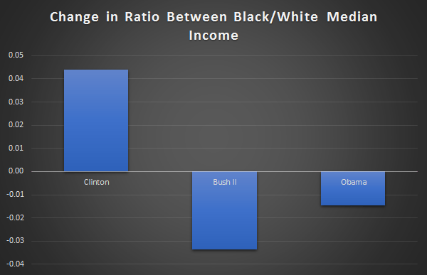For Beauchamp, politics is either about economics or it’s about immigration and racism. He misses the possibility that these things intersect in complicated ways. The right splits working class whites off from the left by portraying left wing economic policies as racially favoring people of color, but it only gets away with this because for several decades left wing parties have done little to protect the interests of the white working class, aiding and abetting the erosion of the systems which defended them in the 50s and 60s. The white working class is nostalgic for the 50s and 60s because that’s when New Deal and Great Society programs ensured they had a chance. But the far right misleads them about why that chance has diminished, blaming the left for giving the benefits of these programs away to minority groups. In reality the left has helped the right erode these programs for everyone, even people of color–the black percentage of white median income isn’t higher now than it was in the early 90s, and it declined under Barack Obama:
