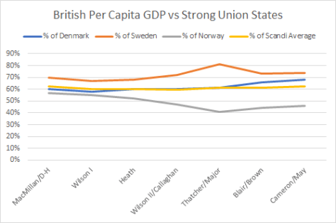 If there was an economic return on weakening Britain’s unions, that return seems to have been exhausted by around 1990–when union density returned to the pre-Wilson level (around 40%). There’s also plenty of evidence to suggest that weakening the unions may not have been necessary at all–in the Scandinavian countries, union density remains much higher (67% in Sweden, 52% in Norway, and 67% in Denmark). Yet each of these countries have continued to best Britain in per capita GDP throughout the last half-century, and Britain has not made significant gains against the three as a group since diminishing its unions: