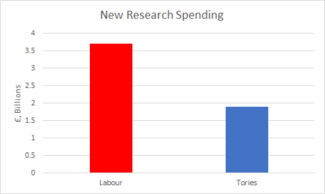 Labour promised to increase R&D funding from 1.7% of GDP to 3%. That’s about a £3.7 billion annual increase. In their manifesto, the Tories promise to increase R&D funding to 2.4% with a “longer-term goal” of eventually reaching 3%. Going to 2.4% would amount to about a £1.9 billion annual increase.