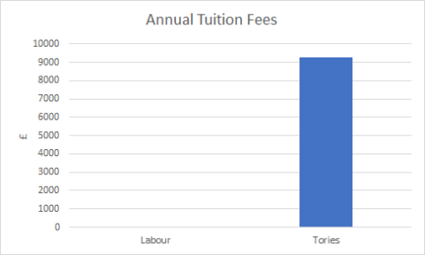 Labour has promised to eliminate university tuition fees and reintroduce traditional maintenance grants. The Tories make no mention of changing tuition fees in any direction. This would leave annual tuition at £9,250 for British and EU nationals attending universities in England.