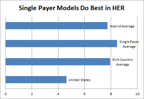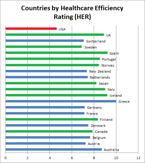 America is in red. The green countries use single-payer, and the blue countries use hybrid systems which contain large public components. Overall, the single payer systems are the most efficient: