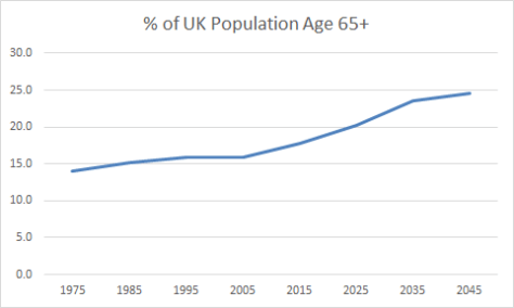 This has come even as the percent of the UK population over age 65 has increased, meaning that spending has fallen even as the need for healthcare has risen: