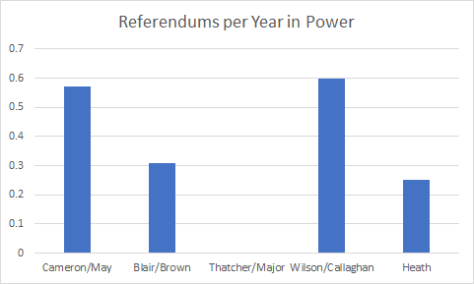 Theresa May constantly talks about “strong and stable leadership”. There’s nothing strong and stable about allowing the NHS, infrastructure, productivity, and wages to stagnate and deteriorate. There’s nothing strong and stable about calling an election you promised you wouldn’t call precisely because it would lead to “instability”. There’s nothing strong and stable about abandoning crucial questions which deeply concern the national interest to haphazard referendums in which the public is flooded with incorrect and incomplete information. No government since Callaghan’s has held referendums so often, and the Tory referendums have been high stakes–they gambled the electoral system, Scottish independence, and EU membership instead of making potentially unpopular political decisions: