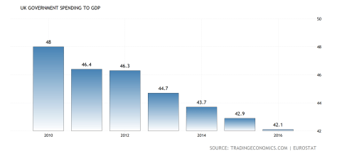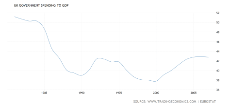 The spending also wasn’t as massive as people remember–British government spending was much higher during the Thatcher years: