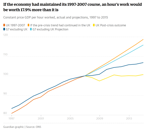 So in 2010, the British elect a coalition government led by the Conservative Party’s David Cameron. Cameron immediately begins doing austerity–he cuts government spending to in an effort to reduce the debt. The trouble is that when government spending is reduced, this cuts the legs out from under economic demand. Cameron cut benefits, salaries, and reduced subcontracts putting less money into consumers’ pockets. In the early years of the Tory government, this caused British growth to lag: