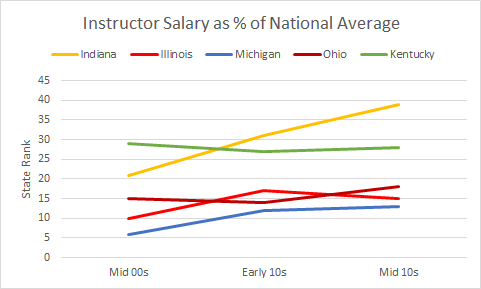Under governors Mitch Daniels and Mike Pence, Indiana has reduced school funding. Between 2011 and 2016, state education spending has fallen by about 11.5% relative to GDP. This has pushed Indiana teacher salaries down, moving it from a midlevel state to one of the worst states in the nation for teacher salaries: