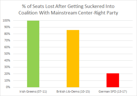 Sometimes left wing parties can go into coalitions with other left wing parties and things work out. Sometimes right-wing parties can go into other coalitions with right-wing parties and things work out. But when the junior partner is left-wing and the senior partner is on the right, it’s usually a disaster for the left-wing party: