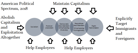For this reason, I classify both socialists and postwar liberals as “left” and as “left egalitarian”. They would push the same kinds of policies in the medium-term. But it is important to remember that the postwar liberal is still a liberal, and when push comes to shove that will show. Postwar liberalism was liberalism’s compromise with socialism–it was not an abandonment of liberalism outright. I then classify the party establishments from the 70s, 80s, 90s, 00s, and 10s of both the Democrats and Republicans as “neoliberal”. Finally, there is the newly emergent group on the right, which promises to help workers get a better deal not by increasing their bargaining power vis-a-vis their employers but by targeting immigrants, minorities, and foreigners. I call these people “right nationalist”.