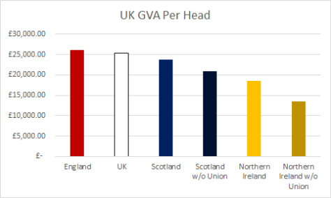 When Scotland was considering independence, one of the best arguments for keeping Scotland in the UK was the scale of economic transfers which Scotland receives from Westminster. If you took all the money the British state spent in Scotland and subtracted all the revenue which Scotland contributed to the treasury, Scotland netted £2800 per head. In total, this amounted to £15 billion in free money Scotland received simply for continuing to be part of the UK. Scotland is poorer than the rest of the UK, but it would be much worse off without that money. Its gross value added per head would be reduced by almost 12%: