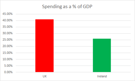 The best way to illustrate this visually is in the spending to GDP ratio. The British state commands over 41% of its GDP–Ireland only commands 26%: