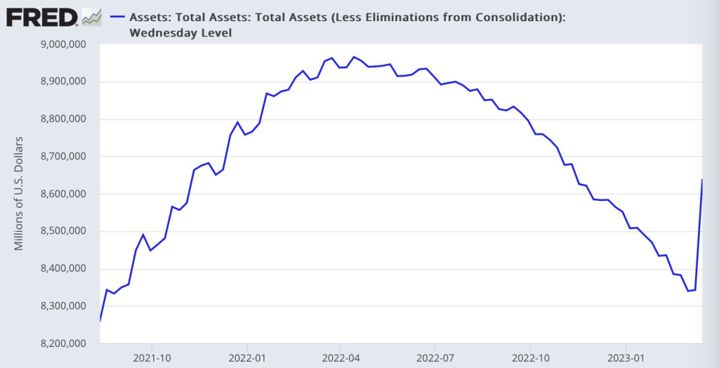 Each of these lines suggests a different policy response. If SVB alone is to blame, then there’s nothing fundamentally wrong with the Federal Reserve’s strategy and there’s no reason for it to abandon rate hikes. This can, however, be straightforwardly disproven, if the Federal Reserve presses ahead and more banks fail. If private banks are primarily to blame, rate hikes will only work if the banking system is redesigned. But since we have a divided congress and a president who is unable or unwilling to persuade his own party to vote for major reforms of this kind, it is not politically possible to take that kind of action. If the Federal Reserve is primarily to blame, then rate hikes have to be abandoned and/or the Fed must take other kinds of action to offset the effect of the rate hikes. As it happens, this is what the Fed has decided to do, quickly acquiring assets in a bid to recapitalize the banks: